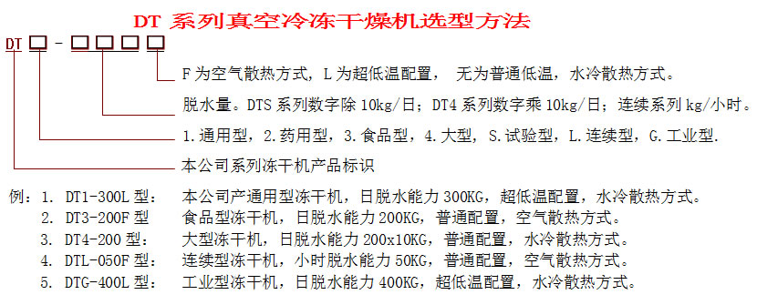 為方便用戶選型,DT系列冷凍干燥機(jī)按不同干燥對(duì)象和不同用途劃分為六個(gè)子系列,分別為DT1通用系列(一體機(jī))、DT2藥用系列(一體機(jī))、DT3食品系列(分體機(jī))、DT4大型系列(分體機(jī))、DTL連續(xù)系列(無人一體機(jī))和DTG工業(yè)系列。每個(gè)系列按脫水量分為6個(gè)規(guī)格型號(hào),每個(gè)規(guī)格型號(hào)按制冷配置分普通型和超低溫型,按殼體材質(zhì)分碳鋼型和不繡鋼型,共約140多種規(guī)格型號(hào)可供選擇。